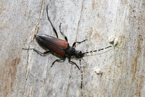 アカハナカミキリによく似ていますが、触覚が名前のように黒と黄白色のだんだら模様なので見分けられます。上翅は普通赤ですが、黒色が混じるものから全体が黒化するものまで変異があります。
