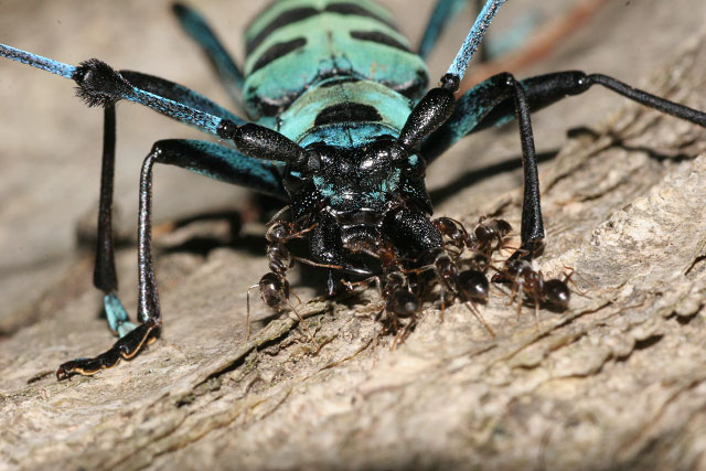 下2枚の写真はどういう経過でこのような事態になったのか分かりませんが、ルリボシカミキリはこの時点ではまだ生きていて、アリは大顎を中心に攻撃をくわえていました。