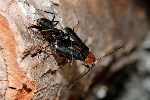 アリの巣の出入口付近で攻撃を受ける ルリボシカミキリ(安曇野市:次も同じ)