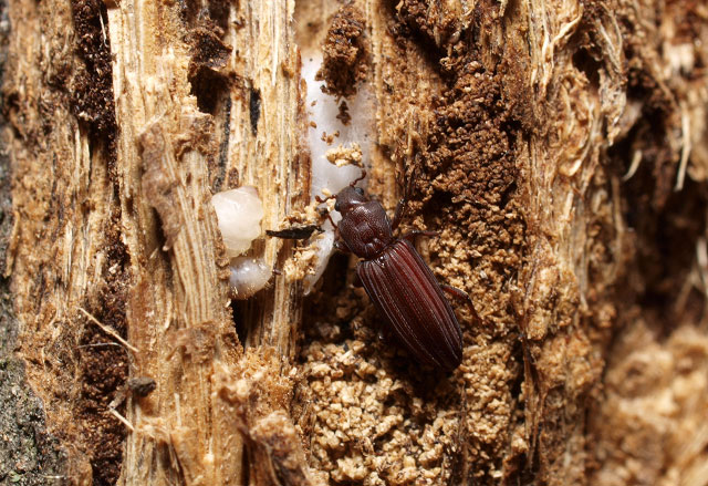 ホソカタムシの仲間では、カミキリムシ幼虫の捕食者としてサビマダラオオホソカタムシがよく知られています。今のところ長野県での採集記録はないようですが、たまたま同じムキヒゲホソカタムシ科に属するムネクボスジホソカタムシがカミキリムシの幼虫を攻撃している場面に遭遇しました。