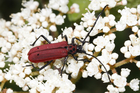 ベニカミキリによく似ていますが、翅端前方に黒点が2個あるので区別できます。いろいろな広葉樹をホストにするのでベニカミキリに比べ見かけることの多いカミキリです。