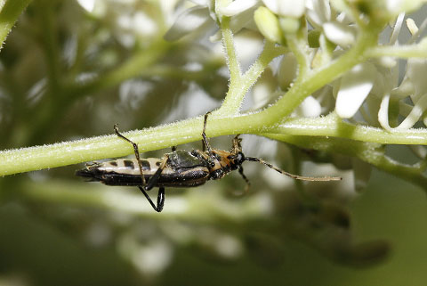 ミズキに訪花したヘリグロホソハナカミキリ(左触覚の9節以降は欠けている)