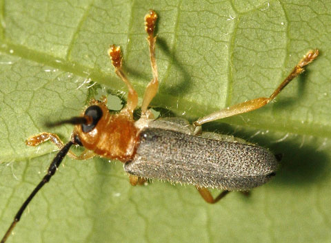 ダンコウバイの葉裏で後食中のヒゲナガヒメルリカミキリ
