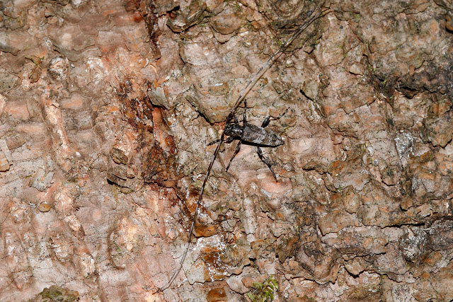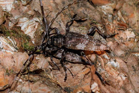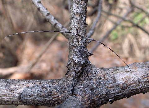 アカマツ、カラマツ、モミなどを寄主植物にする触角の長さが際立つカミキリです。オスの触覚は体長の3.5倍ほどあります。