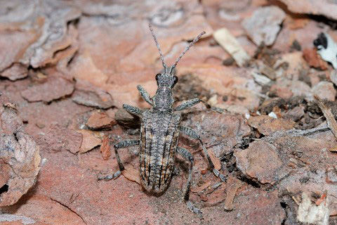 上の写真のように樹幹上で静止していると背景に見事に溶け込んでしまいます。ハイイロハナカミキリより個体数が多く、寄主植物のマツ科の材がある土場や倒木上でよく目にします。土場では材上を歩いている個体もありますが、材と材の隙間に潜り込んだり、交尾しているものも観察されます。