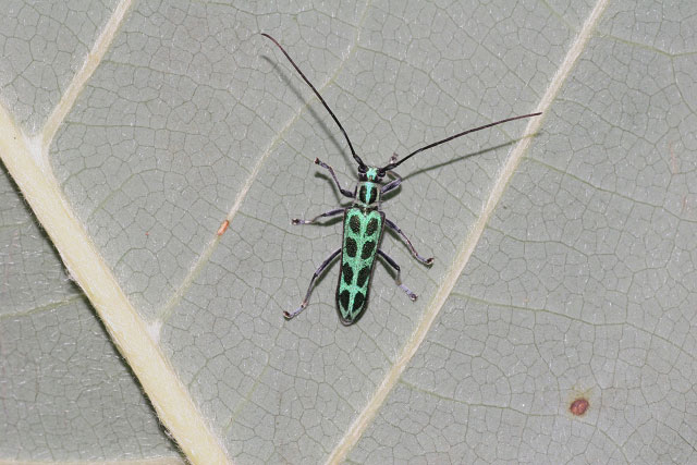 ホウノキの葉裏を歩行するフチグロヤツボシカミキリ