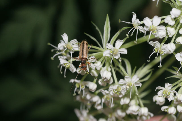 前胸は黒色で前後が黄褐色になり、写真の個体のように中央部も黄褐色になるものもいます。近縁のシンシュウヒメハナカミキリによく似ていて、正確な同定は捕らえて細部を見ないと判断できませんが、前胸の側縁が比較的丸みを帯びている(シンシュウヒメハナは角張っている)ことで大まかに区別できます。