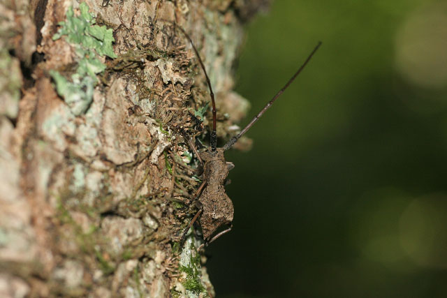 シデ類の立ち枯れで静止するイワワキセダカコブヤハズカミキリ