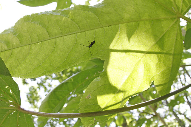 ムネモンヤツボシカミキリを探そうと、サルナシの蔓や葉裏を覗き込んでいたときのことです。カミキリらしい虫がサルナシの混み合った枝の中から飛び出し、隣に生えているハリギリの葉裏に移りました。ムネモンヤツボシにしては小さ過ぎます。そっと近づいて葉裏を見上げると初めて見る本種でした。