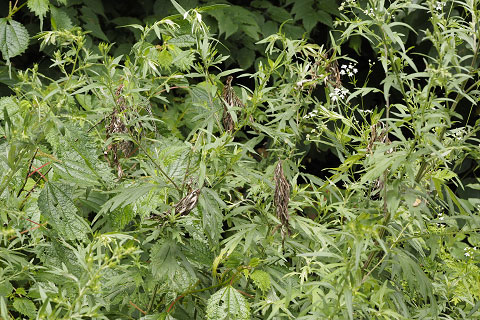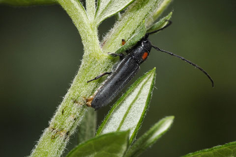 「菊虎」と呼ばれ、キクの害虫として有名なカミキリです。成虫はヨモギなどキク科の茎の上部2ヶ所にかみ傷を入れ、その間に産卵するため、かみ傷より上の部分はしおれたり折れたりするので、このカミキリの存在がわかります。