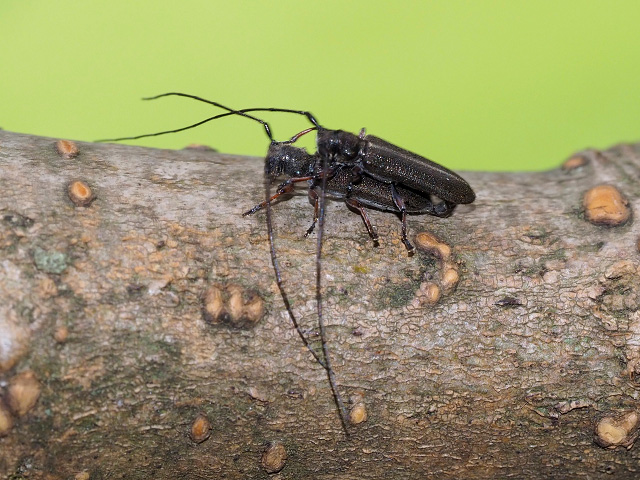 里山から1500mを超える山地まで普通に見られるカミキリです。 各種広葉樹を寄主植物にし、1p程度の細い材から太い材、さらに蔓植物でも見ることがあり、静止しているときは触覚を前方に向けた姿勢をとります。