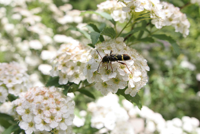 コデマリの花で採食するキスジトラカミキリ