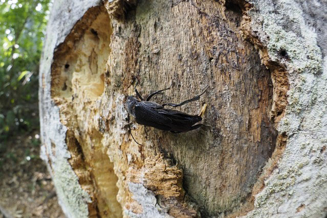 ブナの立枯木で他の甲虫の脱出孔に産卵するコバネカミキリのメス