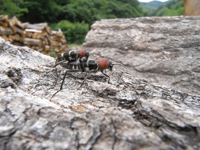 薪材の上で交尾するクビアカトラカミキリのペア