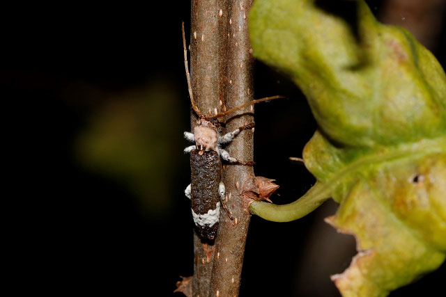 あたりが暗くなると、それまで体軸に対し直角に開いていた触角を前方へ突き出し、ゆっくり動きはじめました。動作は緩慢、つる上を数センチから最大25センチほどを移動しては、また静止することを繰り返しています。少なくともこの時季の活動の中心は夜間のようです。