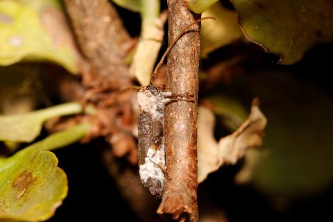 11月上旬、ツルウメモドキの葉陰で発見した個体は日中全く動く気配がなく、日没を待って観察することにしました。