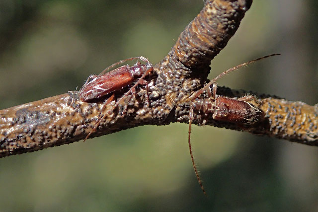 夢が叶ったのは9月中旬、コブヤハズカミキリ類を探して南アルプス山麓を歩いていたときのことです。枯れ枝のたくさんあるミズキの下枝を見回していたところ、小枝の上になにやら虫らしいものが。