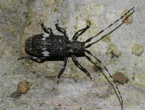 サビカミキリ属のカミキリによく似ていますが、触覚が長く、第3節以降の基半部が赤褐色になること、上翅の後半部にある横帯は白くて大きく波打つことなどで区別できます。