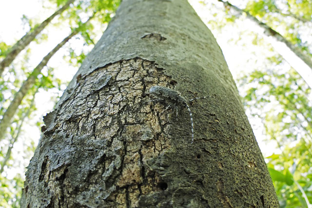 ブナ立枯木で産卵場所を探すマダラゴマフカミキリのメス
