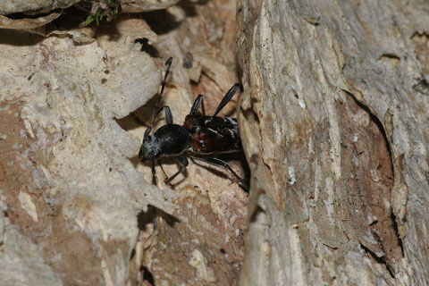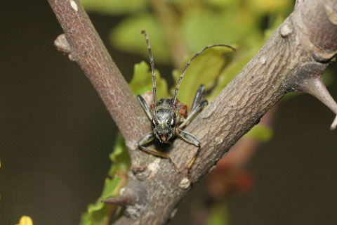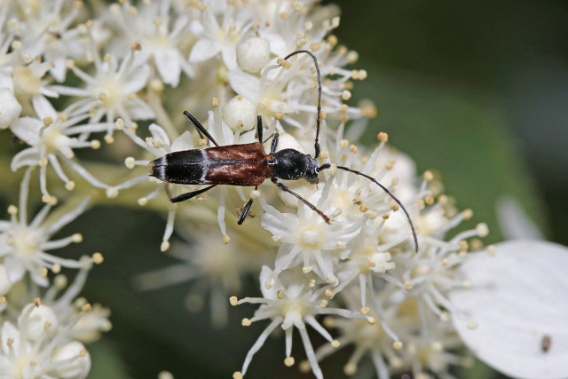 トガリバアカネトラカミキリ亜属の中で最も普通に見られるカミキリです。