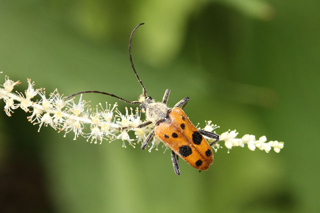北方系の種で長野県では稀なカミキリですが、御嶽山麓を歩いていたところ、日陰にあるトリアシショウマに訪花し、ひっそりと採食していました。明るい黄褐色の地に大小の黒紋をちりばめた姿が鮮烈です。