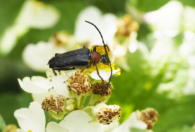 ノイバラに訪花したムネアカクロハナカミキリのメス