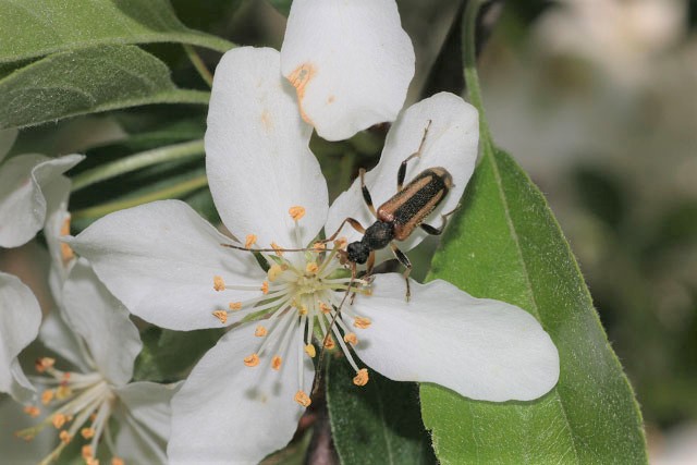 ズミの花で採食するナガバヒメハナカミキリのメス