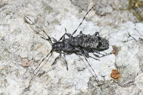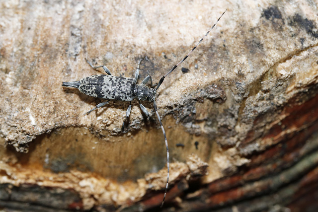 ヤナギ類の倒木上を歩行するニセゴマダラモモブトカミキリのメス
