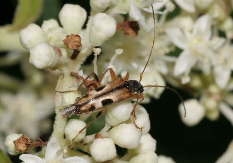 よく似たヨコモンヒメハナカミキリより低い里山からブナ帯付近までに生息するヒメハナカミキリです。個体数も多くガマズミやカンボクなどの花によく飛来します。