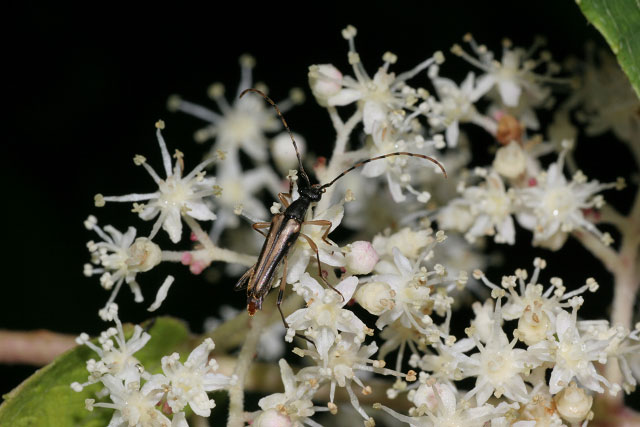ノリウツギの花で採食するニョウホウホソハナカミキリのオス