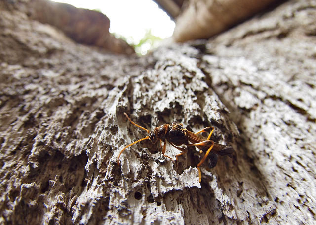 このメスは空洞内を歩き回り、芯腐れ部分にある甲虫の脱出孔やさけ目に産卵していました。
