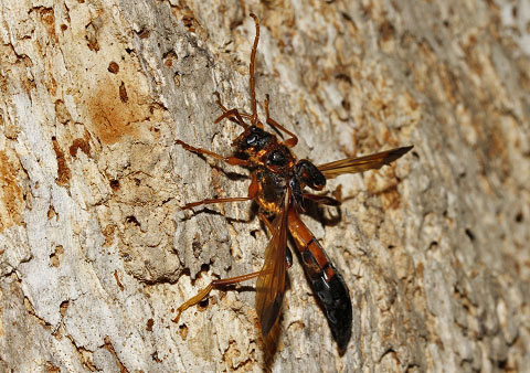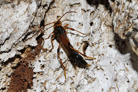 腹端を曲げキクイムシの脱出孔に産卵する同じ個体