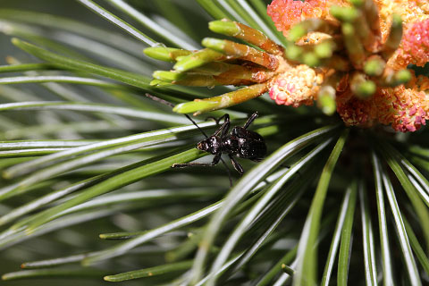 ハイマツの花で採食するオトメクビアカハナカミキリ