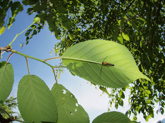 ソメイヨシノの葉裏に静止するリンゴカミキリ
