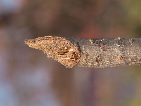 本種の終齢幼虫は穿孔している細枝を斜めに切断し、木屑を詰めて越冬する習性があります。これを手掛かりに松本・安曇野地方の桜の名所などを毎年秋季に探してみるのですが、今のところ全く確認できていません。