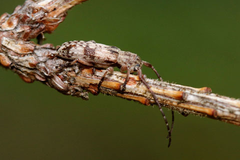 コメツガの枯れ枝を歩くシロオビドイカミキリ