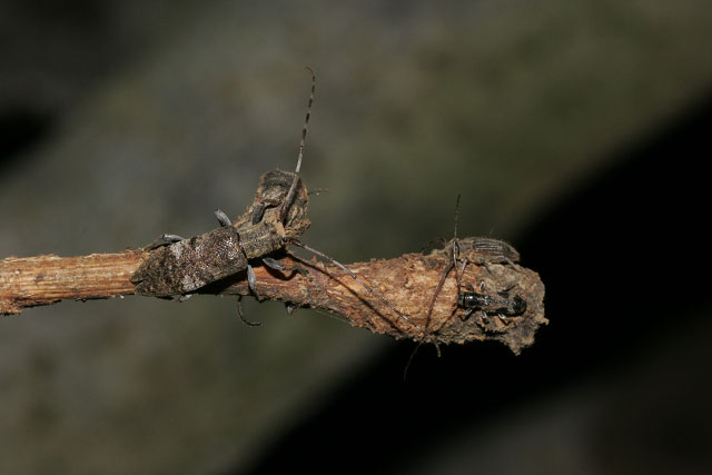 広葉樹のソダに飛来したシロオビチビカミキリ(左)