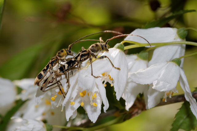 ウツギで交尾するシロトラカミキリのペア