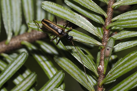 リリース後シラビソの葉裏に回り込んだタカネヒメハナカミキリのオス