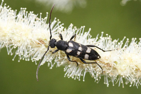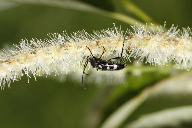 クリの花穂の下面で採食するヤマトキモンハナカミキリ
