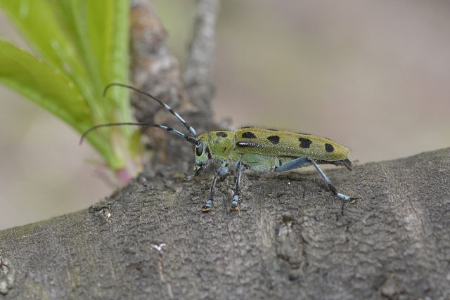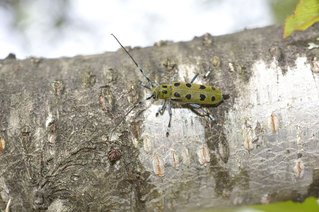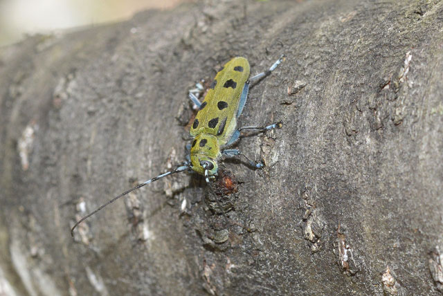 枝上を歩くヤツボシカミキリ