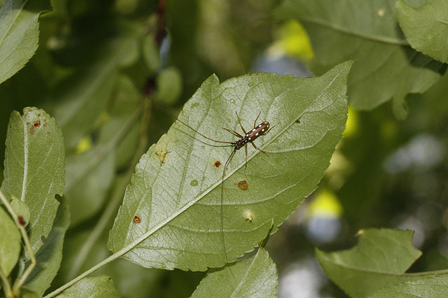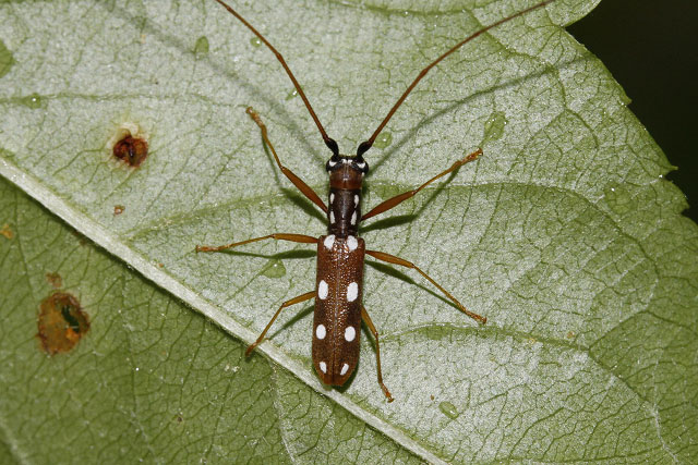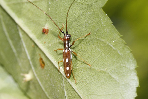 ズミの葉裏で静止するヤツボシシロカミキリ