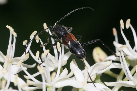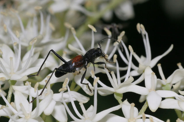 比較的稀なカミキリですが記録は各地にあり、長野県では広く薄く生息しているようです。ムネアカオオアリに擬態しているのでは、と思わせるほど歩き方もアリによく似ています。