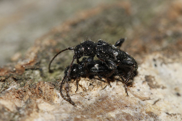 伐採枝上を歩く2頭のヨツボシチビヒラタカミキリ